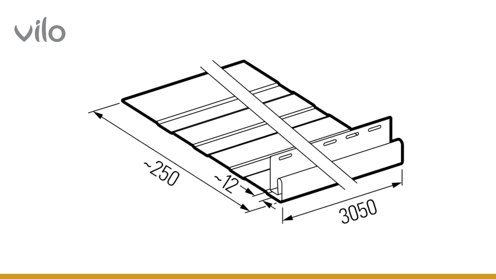 Profilul de fațadă mare Vilo SV-19 este realizat din PVC-U, material destinat utilizării exterioare. Lungimea standard a profilului este de aproximativ 3050 mm, cu o lățime de acoperire de aproximativ 250 mm, conform schiței tehnice. Profilul este prevăzut cu orificii longitudinale pentru montaj mecanic, realizate din fabrică. Se montează pe structură suport din lemn sau profile metalice, respectând distanțele de ventilație recomandate. Temperatura optimă de montaj este între 0°C și 30°C, cu aclimatizarea profilului înainte de instalare.