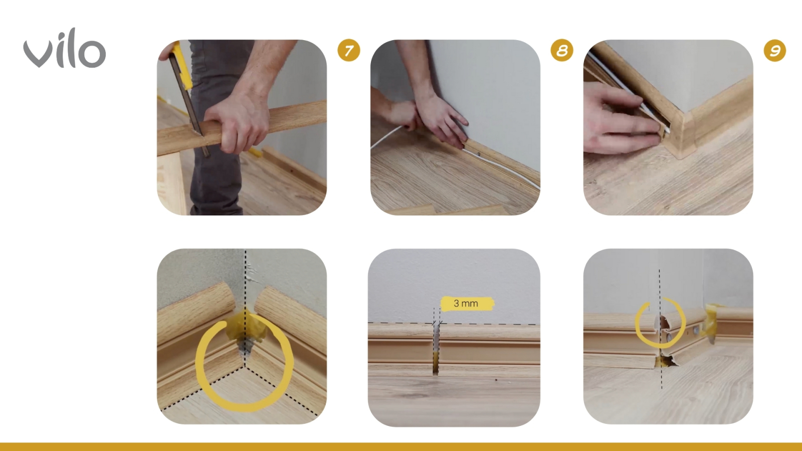 Pentru un finisaj corect și uniform, se recomandă utilizarea îmbinărilor originale Vilo Flex, în aceeași culoare cu plinta. Acestea maschează complet zona de contact dintre segmente și elimină diferențele de nuanță sau spațiile vizibile.