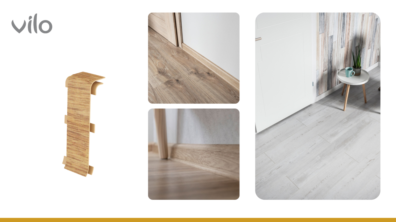 Forma și dimensiunile îmbinării sunt adaptate exact profilului plintei Vilo Linela, asigurând o potrivire precisă și o continuitate vizuală perfectă. Utilizarea accesoriilor dedicate este esențială pentru păstrarea aspectului uniform al sistemului de plintă.