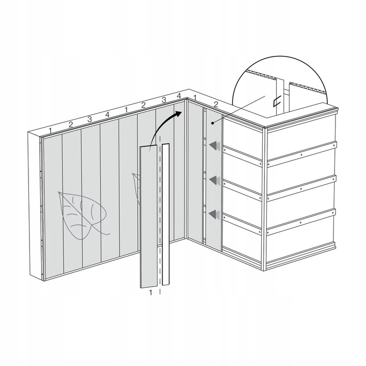 Panourile se montează de la stânga la dreapta, iar sistemul de îmbinare nut și feder asigură o aliniere corectă și un aspect continuu al suprafeței placate.