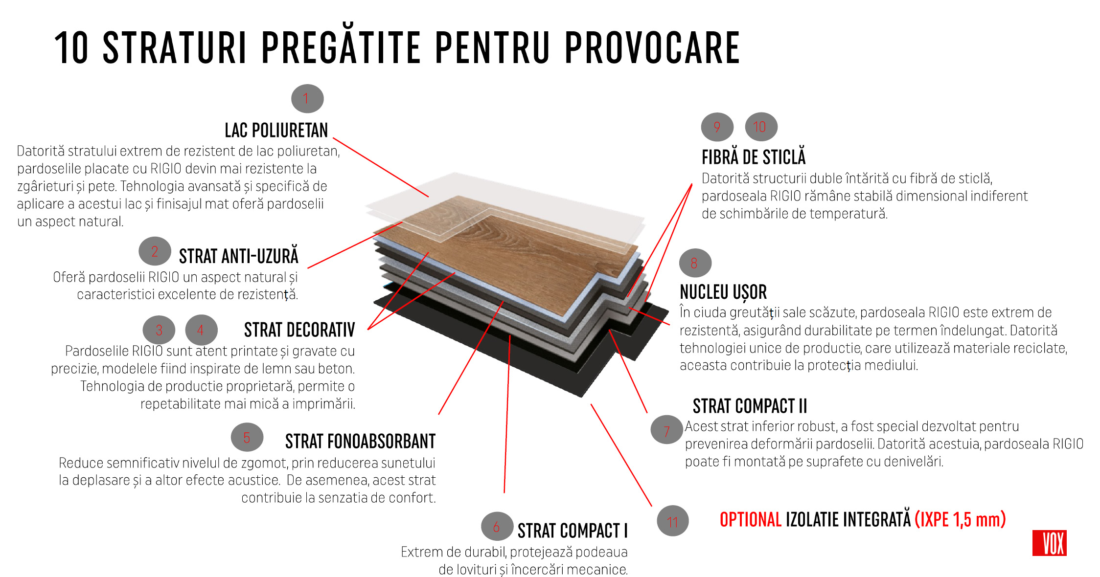 0,55mm este stratul transparent protector care acoperă decorul. Grosimea 0,55mm echivalează cu clasa comercială AC5 - cea mai rezistentă categorie pentru vinil.  Pentru comparație: • Parchet rezidențial standard: 0,3mm • Parchet comercial: 0,4-0,5mm • VOX Rigio: 0,55mm (nivel comercial superior)