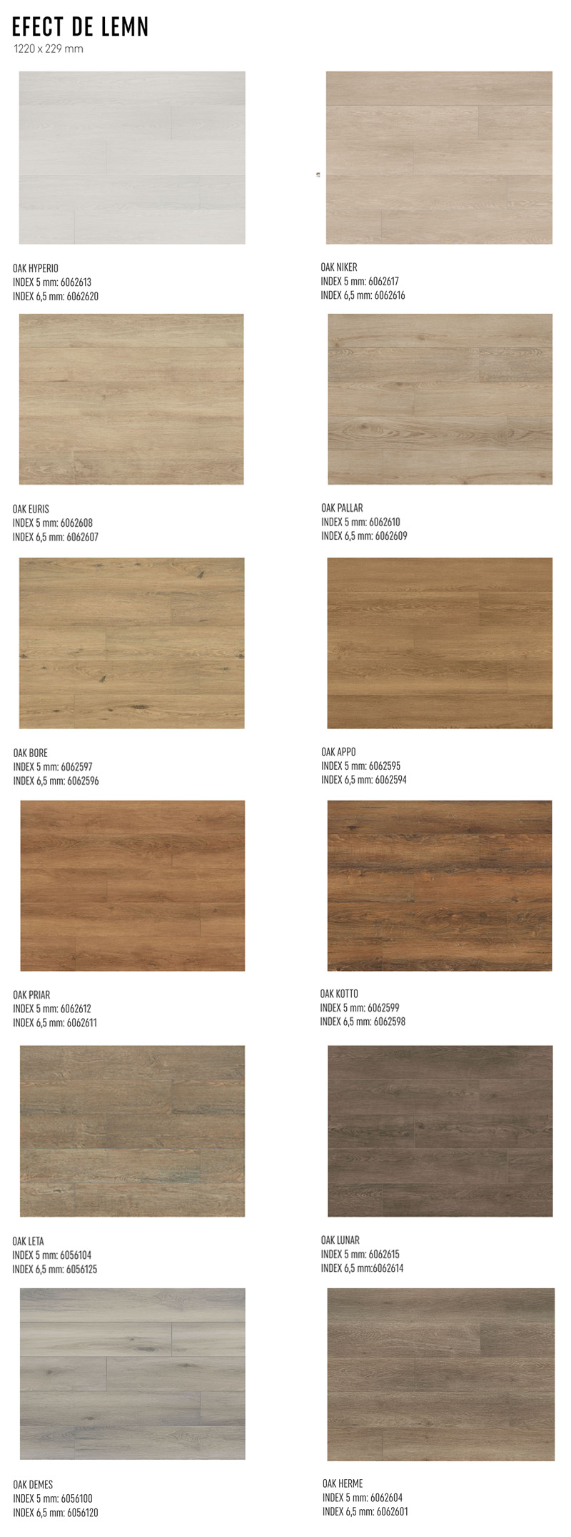 Efect de lemn: Oak Hyperio, Oak Niker, Oak Euris, Oak Pallar, Oak Bore, Oak Appo, Oak Priar, Oak Kotto, Oak Leta, Oak Lunar, Oak Demes, Oak Herme