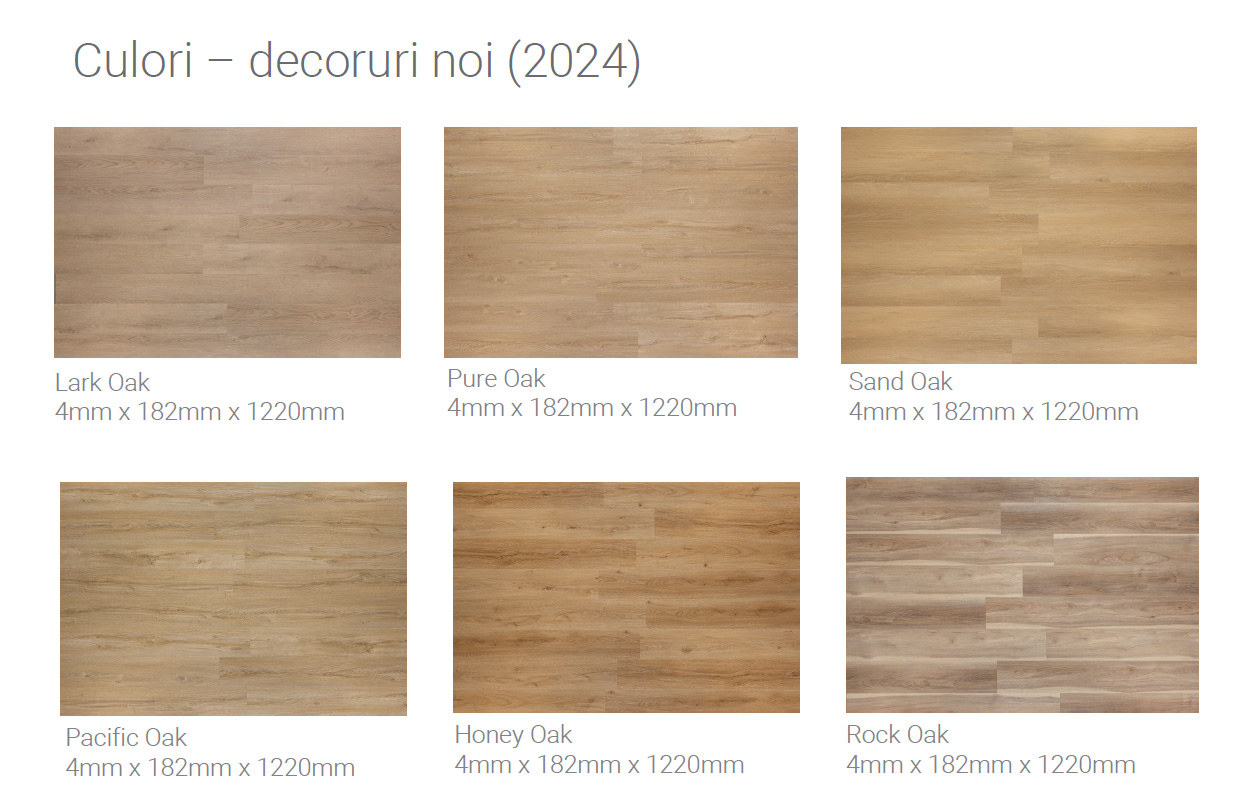 Gama nouă 2024 (6 decoruri) – 182 × 1220 mm: Lark Oak, Pure Oak, Sand Oak, Pacific Oak, Honey Oak, Rock Oak