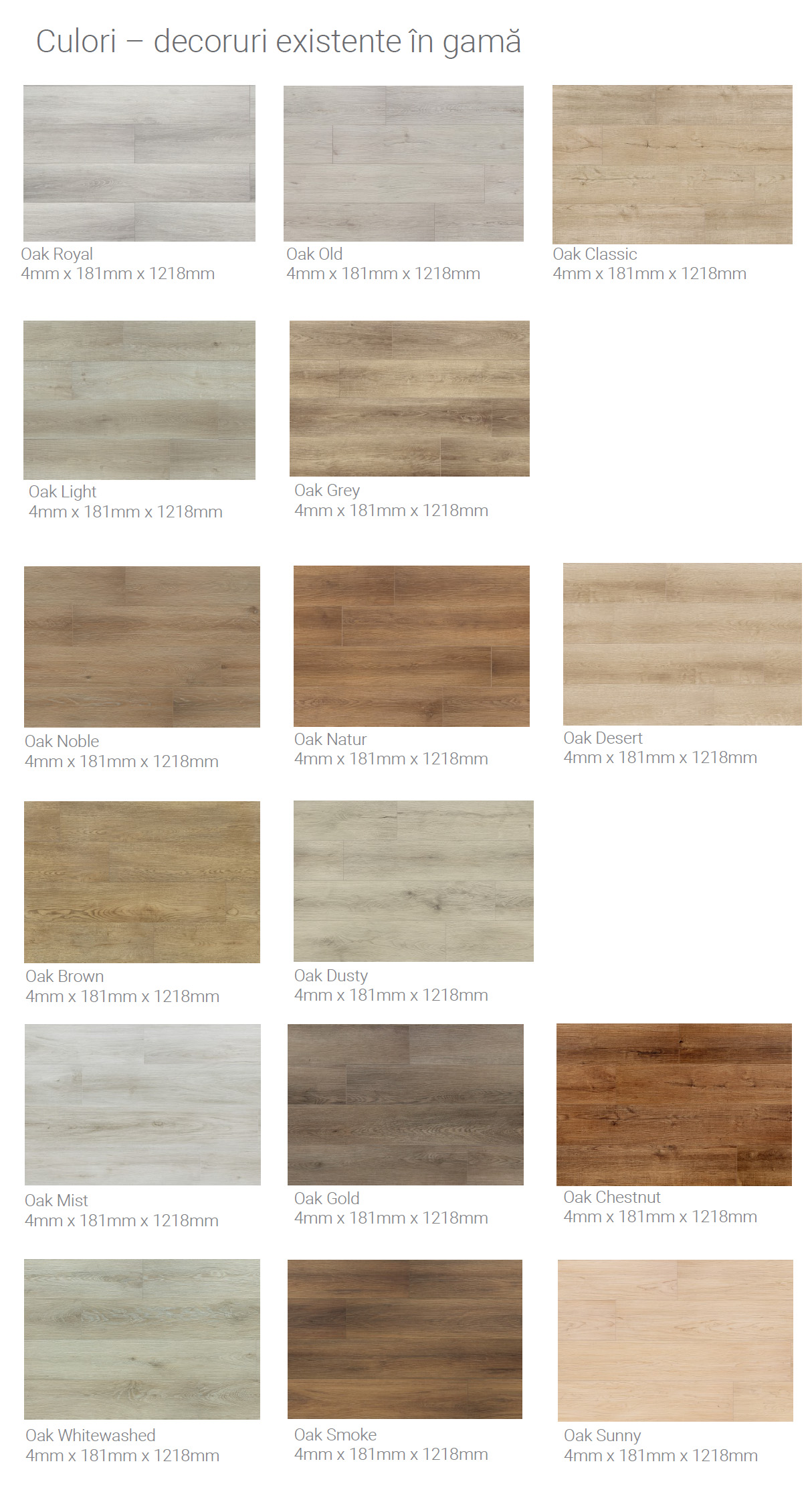 Gama clasică (10 decoruri) – 181 × 1218 mm: Oak Royal, Oak Old, Oak Light, Oak Grey, Oak Classic, Oak Noble, Oak Natur, Oak Desert, Oak Brown, Oak Dusty