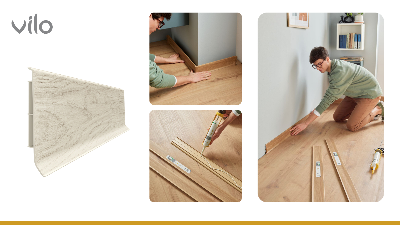 Montajul plintei Linela este extrem de facil, datorită adezivului de montaj Vilo, special creat pentru o lipire puternică și sigură.
